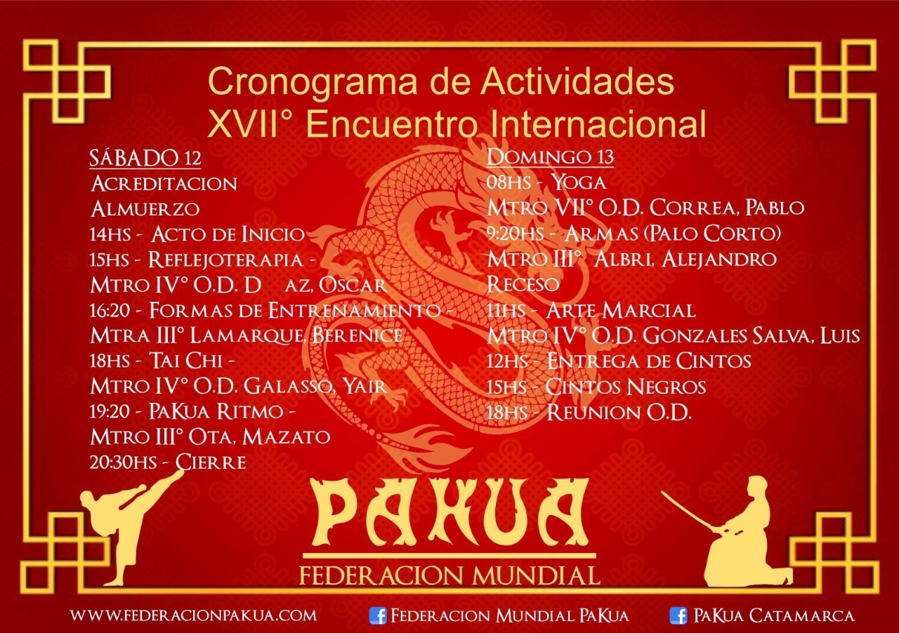 Este encuentro es el evento más importante de la Federación Mundial de PaKua. Año a año cambia su sede y convoca a más practicantes interesados en vivir en su máxima expresión la filosofía PaKua.