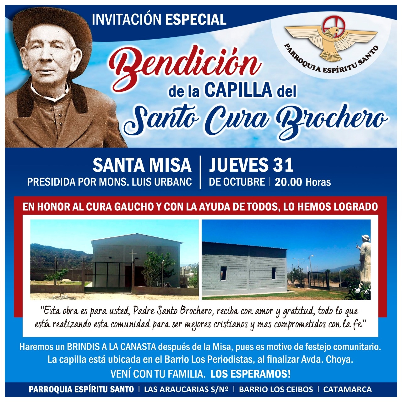 El jueves 31 de octubre, a partir de las 20, se llevará a cabo la inauguración y bendición de la capilla dedicada al Santo Cura José Gabriel Brochero, en el barrio Los Periodistas, jurisdicción de la parroquia del Espíritu Santo, en la zona norte de la ciudad capital.