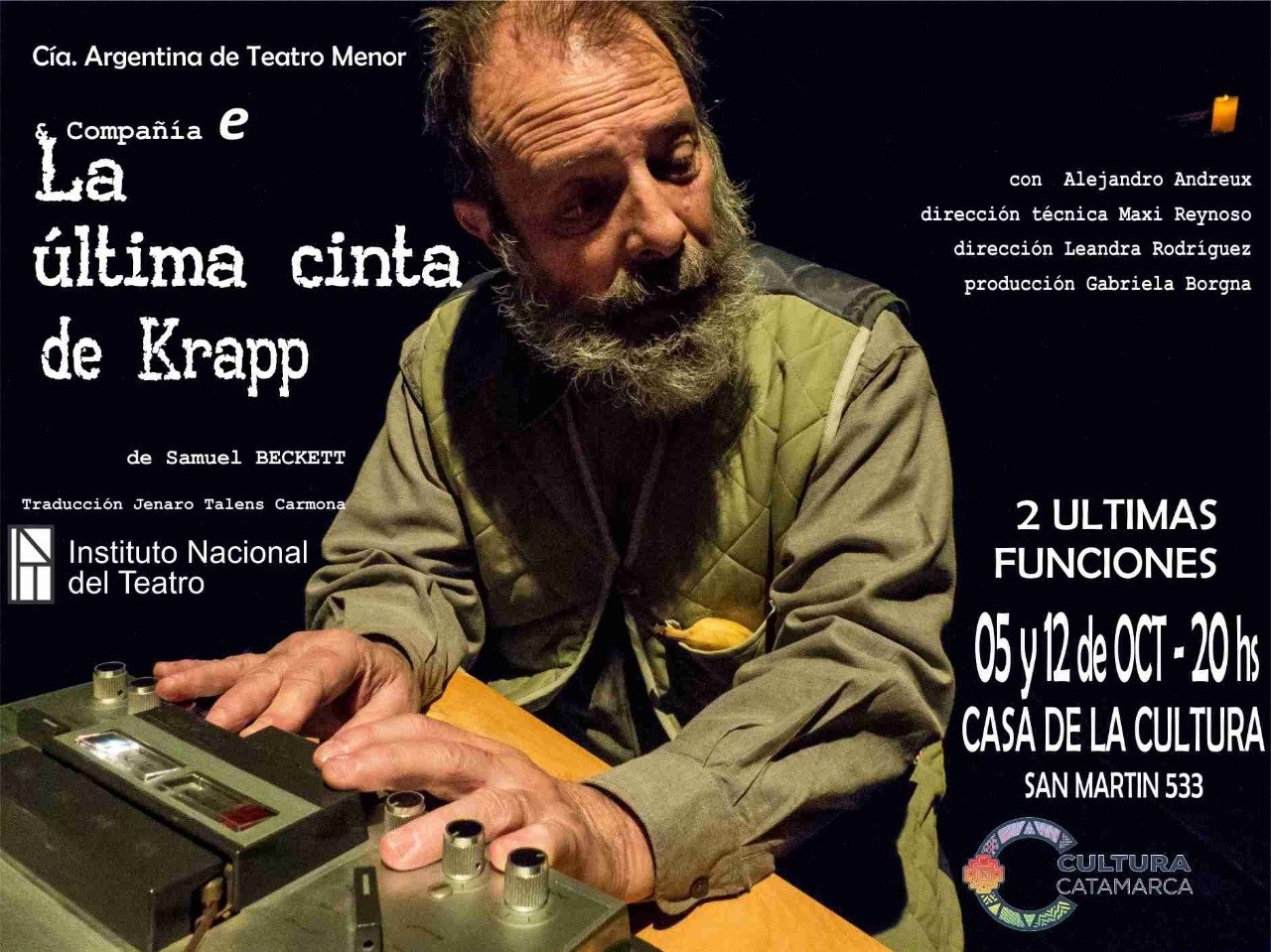 Asimismo, el sábado 5 de octubre a las 20 horas se presentará la obra teatral “La última cinta de Krapp”, de Samuel Beckett, a cargo de la Compañía Argentina de Teatro Menor, con Alejandro Andreux, dirección técnica de Maxi Reynoso, dirección de Leandra Rodríguez, y producción de Gabriela Borgna.
