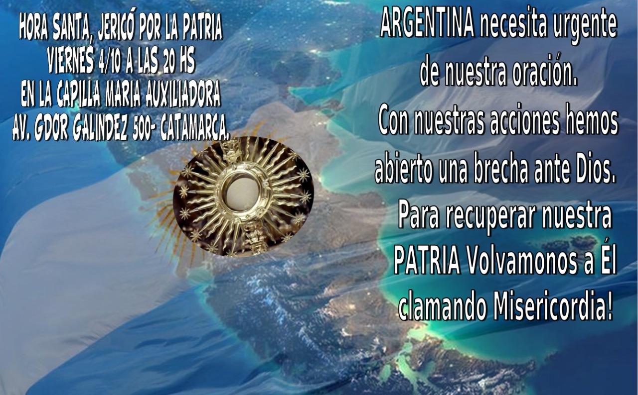 El viernes 4 de octubre, a las 20, se llevará a cabo la 4° Jornada de Jericó por la Patria. En esta oportunidad, tendrá lugar en la capilla de María Auxiliadora, ubicada en Av. Gobernador Galíndez 500, en la Capital.