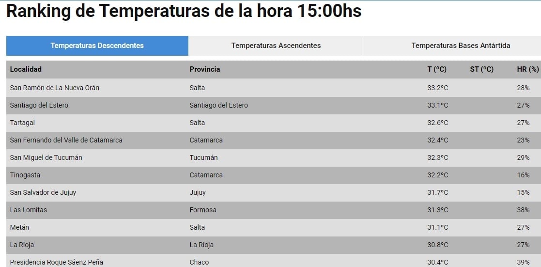 martes, 8 de octubre de 2019 15:44 martes, 8 de octubre de 2019 15:44 Se ubica en el cuarto lugar del ranking elaborado por el Servicio Meteorológico Nacional, que es encabezado por la ciudad de Orán, en Salta.