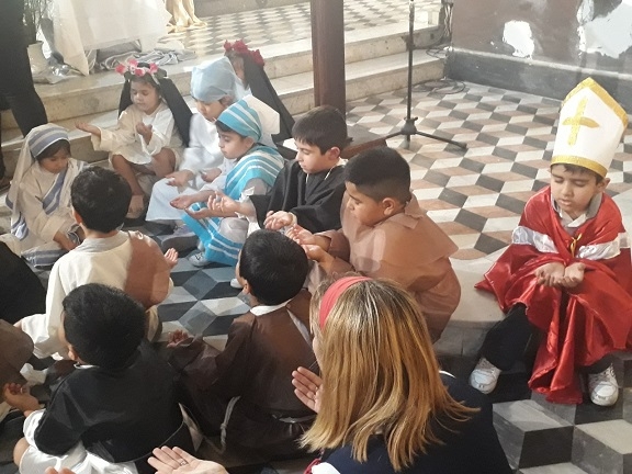 Acompañados por sus papás, abuelos y docentes, junto con miembros y el asesor de la Pastoral de la Niñez, Pbro. Santiago Granillo, los chicos alabaron a la Madre del Valle con cantos, vivas y aplausos.