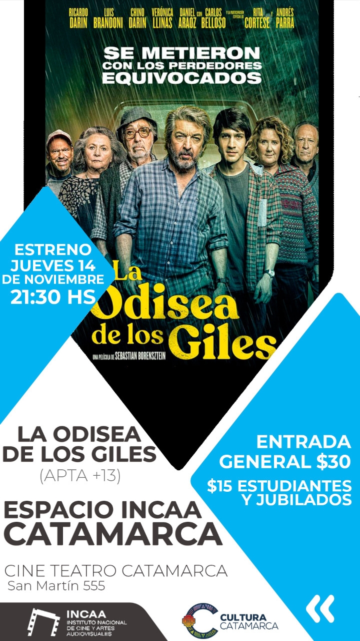 El Espacio INCAA funciona en la sala mayor del Cine Teatro Catamarca, a través de la Dirección de Industrias Culturales de la Secretaría de Cultura, presenta “La odisea de los giles”, film argentino apto para mayores de 13 años con la participación Ricardo Darín, Luis Brandoni, Chino Darín, Verónica Llinás y libro y dirección de Sebastián Borensztein.