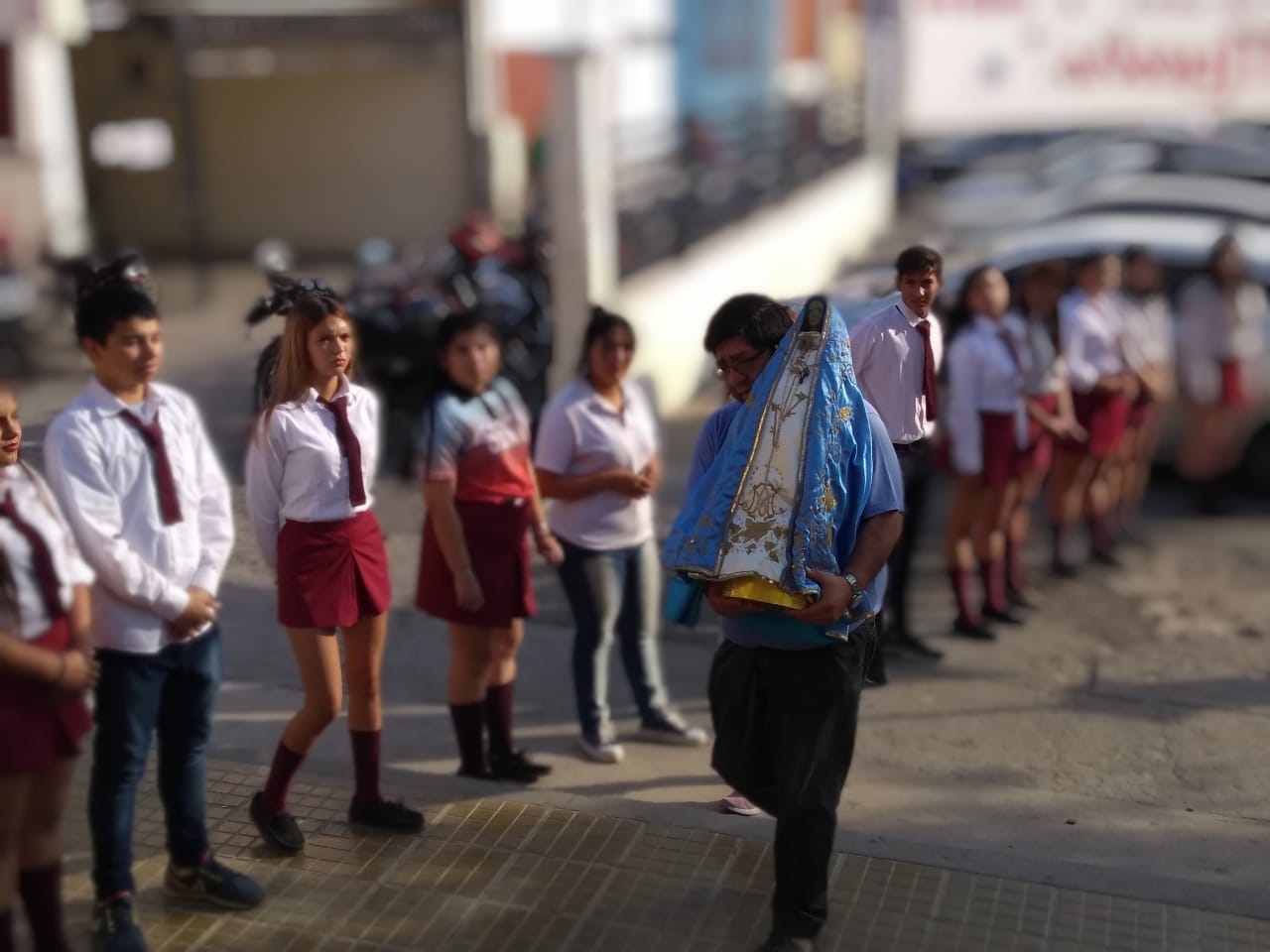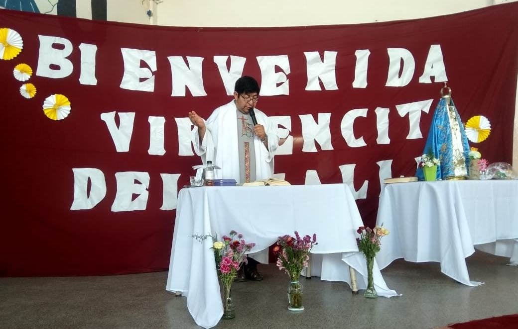 La Imagen peregrina fue llevada hasta la institución educativa por el Pbro. Sergio Chumbita, párroco de San Pío X, con sede en el mencionado conglomerado habitacional, y recibida por directivos, personal docente y de maestranza y alumnos, especialmente los egresados del nivel secundario y también de la escuela primaria Islas Malvinas, quienes formaron un cordón de honor para darle la bienvenida.