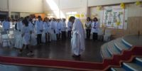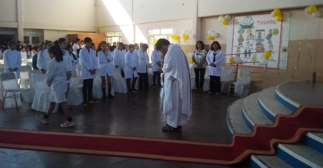 En el patio interno se preparó el altar donde se celebró la Santa Misa de despedida de las promociones 2019, tanto de la escuela secundaria como de la primaria, que acercaron sus ofrendas.