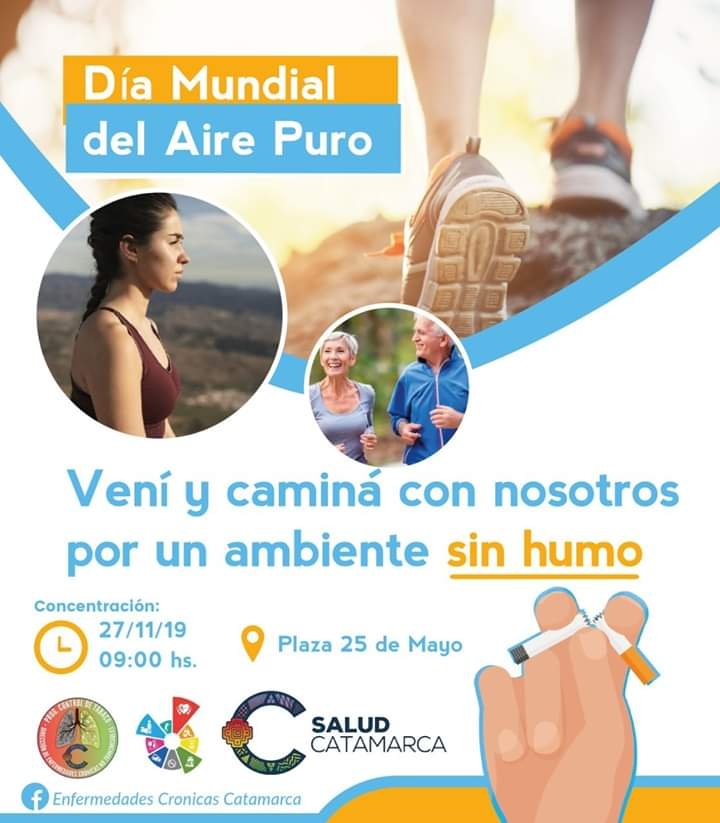 El Ministerio de Salud de la provincia, a través del Programa Provincial de Control de Tabaco y el programa Proteger (Enfermedades Crónicas no Transmisibles), invita a toda la comunidad a participar mañana 27 de noviembre de una caminata que se realizará en el marco del Día Mundial del Aire Puro; conmemorado el pasado 15.