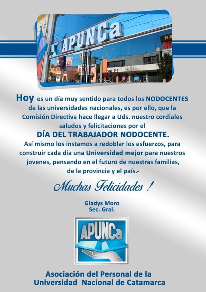 Desde APUNCa, a través de su secretaria general, Gladys Moro, saluda a todos los Nodocentes universitarios de Catamarca.