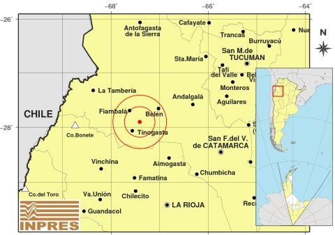 Epicentro: 175 Km. al O de San F. Del Valle De Catamarca; 177 Km. al N de La Rioja; 23 Km. al NE de Tinogasta -27.899 (lat) -67.411 (long)