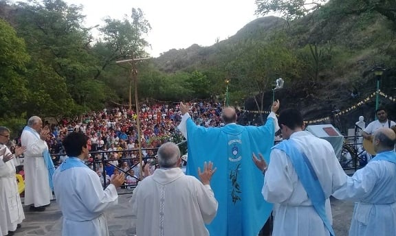 En su homilía, Mons. Urbanc expresó: "Nos encontramos congregados en el lugar histórico donde la Madre Celestial se ha manifestado a nuestros antepasados y se ha comprometido a acompañarnos en la dulce y confortadora alegría de evangelizar, de anunciar a Jesucristo, el Salvador de la humanidad". Y agregó que para esta celebración especial en la Gruta eligió el esquema de la Misa dedicada a la "Bienaventurada Virgen María, causa de Nuestra Alegría".