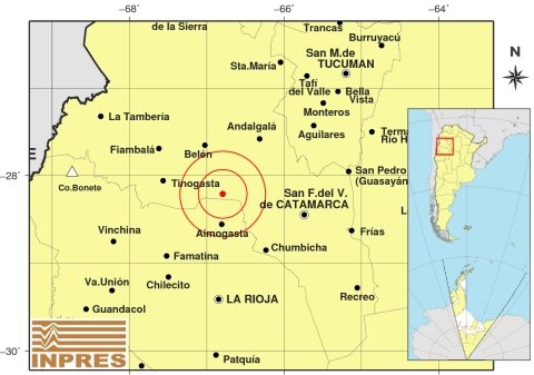 Epicentro: 107 Km. al O de San F. Del Valle De Catamarca; 133 Km. al N de La Rioja; 38 Km. al N de Aimogasta -28.213 (lat) -66.794 (long)