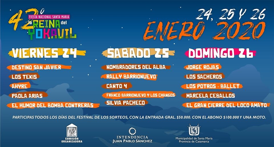 La 42º edición de la Fiesta Nacional Santa María la Reina del Yokavil se llevará a cabo los días 24, 25 y 26 de enero, y el costo de la entrada general será de $500 por noche; o un abono por las 3 noches de $1300.