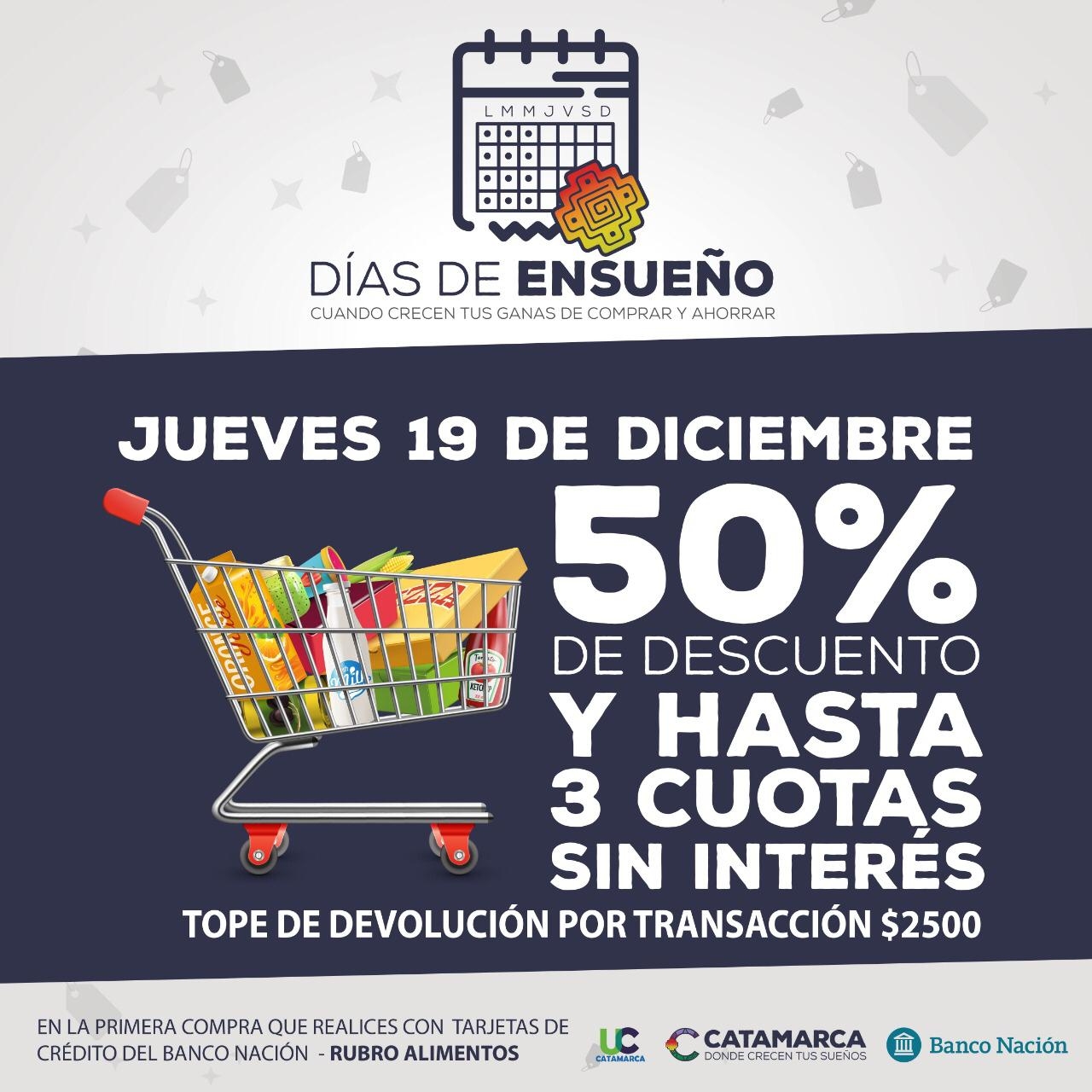 A partir de la ampliación de los topes de reintegro, las compras que se realizan los lunes, martes y miércoles pueden ser de hasta $10.000 cada una y los últimos jueves de cada mes, dentro del rubro alimentos, de hasta $5000, en este caso con la devolución de $2500 en la primera transacción con tarjetas de crédito del Banco Nación.