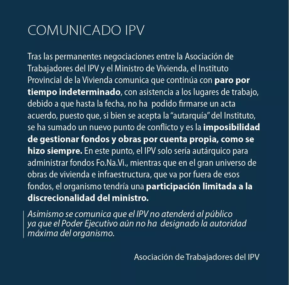 Los trabajadores del Instituto Provincial de la Vivienda continuarán con el paro, teniendo en cuenta que hasta el momento no lograron firmar el acta acuerdo con las autoridades del nuevo Ministerio de la Vivienda.