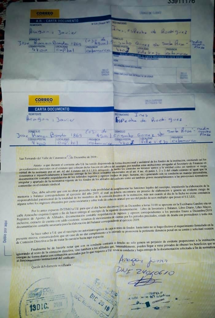 Por otro lado, acompañado por el Adjunto, Gremial y Vocales Titulares nuestro Secretario de Finanzas mandó una carta documento a la secretaria general para que devuelva toda la documentación correspondiente a su secretaría: libros contables, memorias y balances, etc. Con relación a este tema pedimos a la secretaria general, Inés Rodríguez que entregue la documentación que debiera tener el Secretario de Finanzas, que respete los cargos y que tome conciencia que con su accionar perjudica a los afiliados.