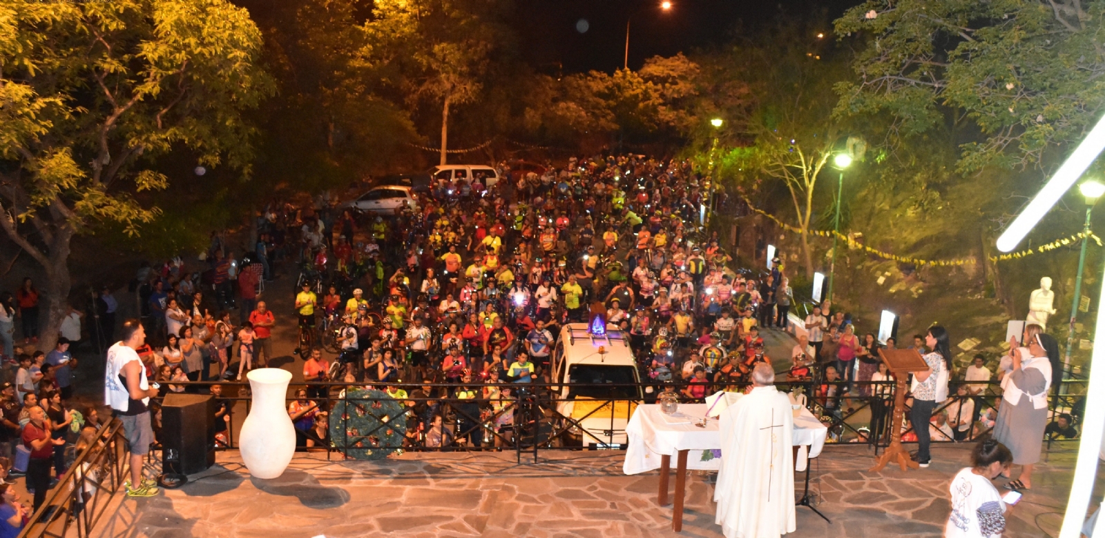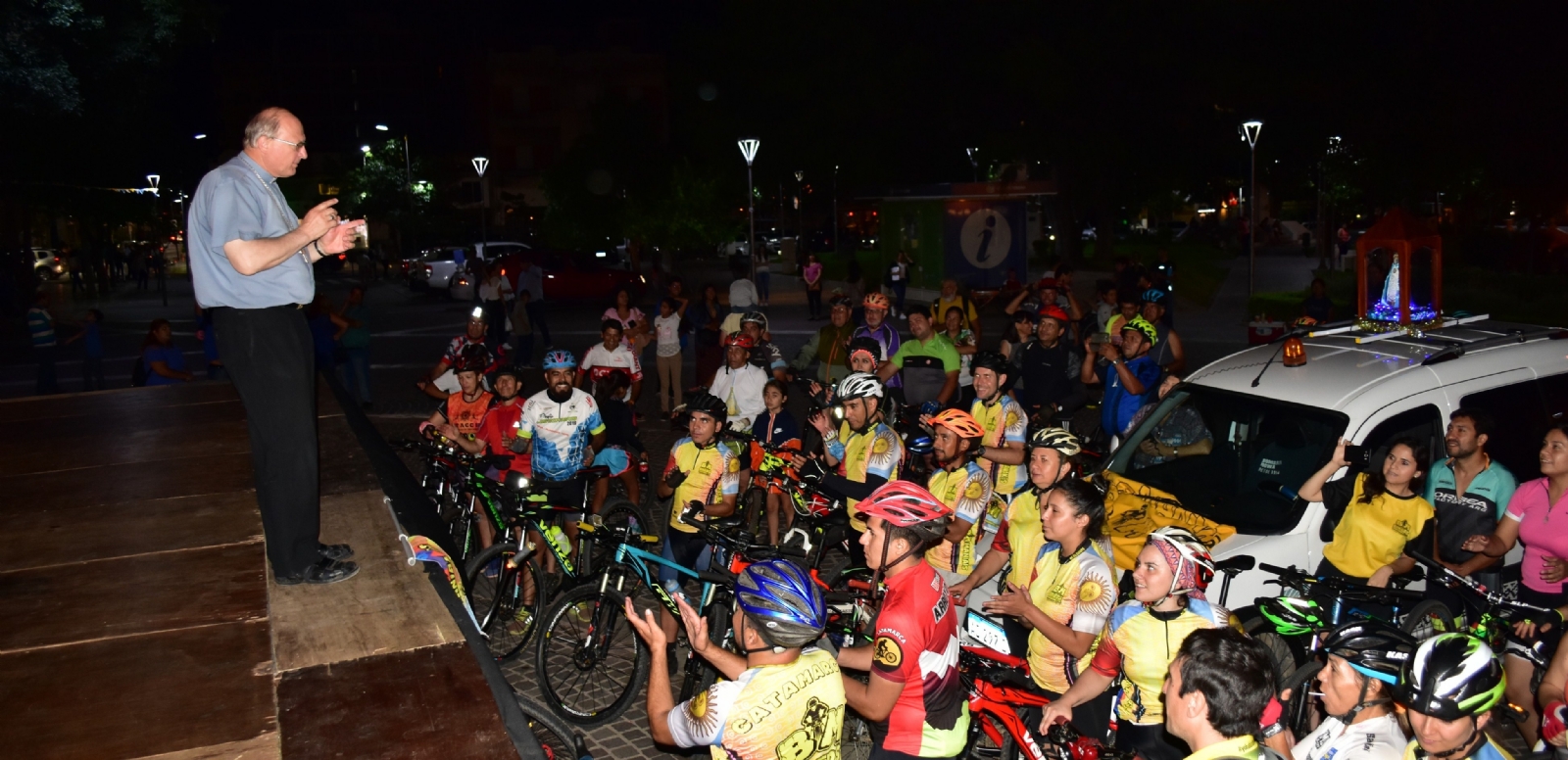 Para culminar el recorrido, se dirigieron hasta la plaza 25 de Mayo, que fue bordeada para llegar al Paseo de la Fe, frente a la Catedral Basílica, alrededor de las 22.00. Allí fueron recibidos con un afectuoso aplauso de los presentes y la bendición del Obispo Diocesano, Mons. Luis Urbanc, a todos los “bici-peregrinos” y público presente.
