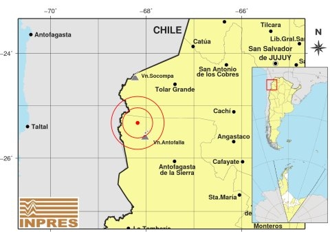 Epicentro: 284 km al O de Salta; 318 km al SO de San Salvador De Jujuy; 112 km al NO de Antofagasta De La Sierra -25.330 (lat) -68.177 (long)