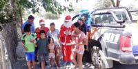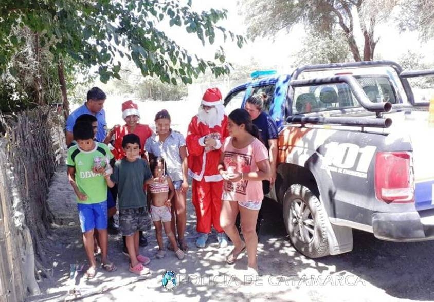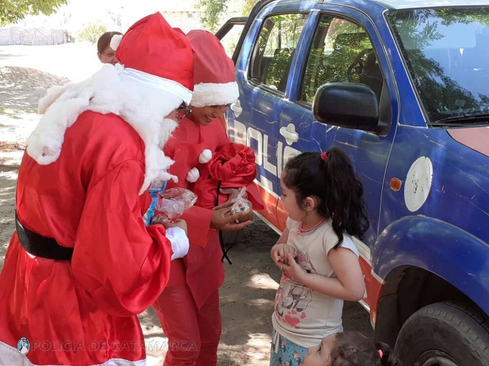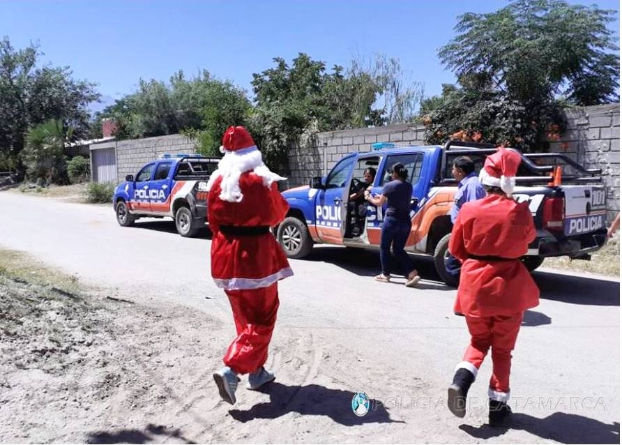 Durante la jornada de hoy, como una forma de acercamiento a la comunidad, efectivos de la Jefatura de Zona “F”, de las Comisarías Departamental Pomán y Saujil, de las Subcomisarías de Mutquin y Siján, y del Grupo de Intervención Rápida (GIR-Saujil), personificaron a Papá Noel y recorrieron distintos barrios de las diferentes jurisdicciones, repartiendo a los vecinos y a los más pequeñitos de la casa pan dulce y golosinas.
