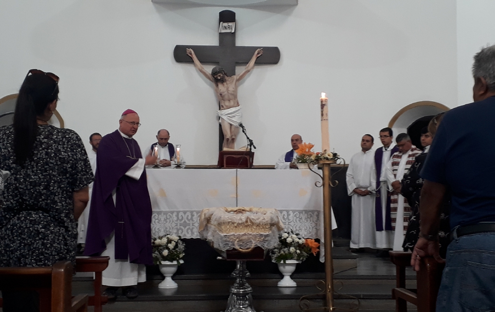 Antes de la bendición final, el Obispo y los sacerdotes se despidieron de su hermano presbítero rociando los restos de su cuerpo mortal con agua bendita y elevando la súplica confiada a Dios por el eterno descanso de su alma.