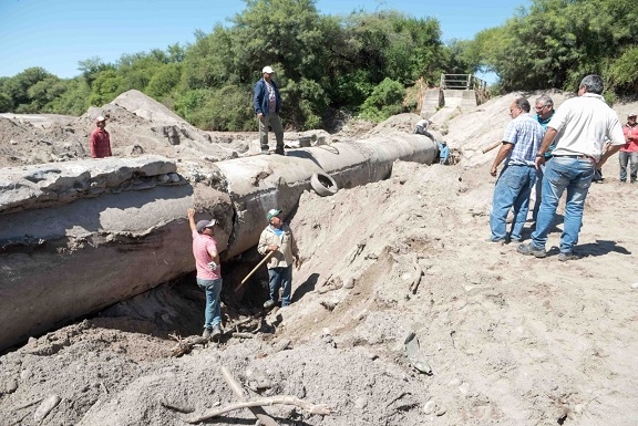 El Intendente de Riego explicó que con la última crecida del río se había destruido el sifón “lo partió en tres, es por eso que estamos trabajando en recuperarlo, ya encontramos las partes que se había llevado el agua y mañana terminamos de repararlos. Creemos que para el lunes o martes podremos volver a dejar pasar el agua por el canal de riego para que puedan trabajar los productores de toda la Colonia y el Bañado”señaló.