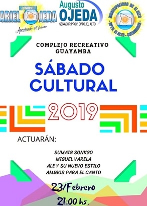 Se llevará a cabo en el complejo recreativos a partir de las 21. Actuarán los siguientes artistas :Sumaig Sonkgo, Miguel Varela, Ale y su nuevo estilo, y Amigos para el Canto.