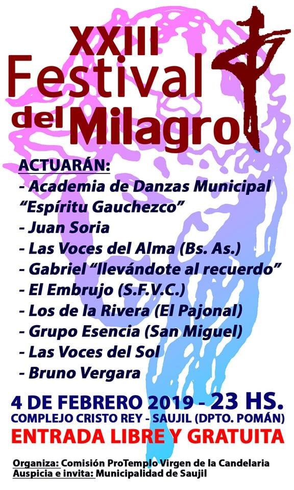 Alejandro Albarracín, integrante de la comisión ProTemplo Virgen de la Candelaria, encargados de organizar este evento comentó que “hemos tomado la postura de no dejar de que este año el festival del Milagro quede en la nada, porque desde la parte eclesiástica de la iglesia, ya habían bajado los brazos porque como está la situación económica era muy factible de que no se lo iba a hacer este festival, pero reunidos con la gente de la zona concordamos que esta es una tradición que nunca tiene que quedar en un vacío, por eso hemos decidido llevarlo adelante a todo pulmón, porque los artistas que se logra reunir para este evento vienen por generosidad y solidaridad, contamos con el apoyo del municipio de Saujil quien auspicia y aporta con números artísticos locales y de la provincia y la logística, desde el vehículo, personal para la limpieza y el acondicionamiento del tinglado donde se va a desarrollar el evento, la iluminación, a partir de la postura del intendente Carrazana que nos dio el ok, nosotros seguimos para adelante con este festival”.