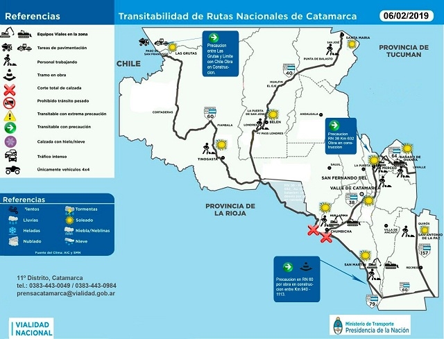 El Ministerio de Transporte de la Nación, a través de la Dirección Nacional de Vialidad (D. N. V.), informa sobre el estado de transitabilidad de las rutas nacionales bajo la jurisdicción del 11º Distrito Catamarca, actualizado a las 6:20.