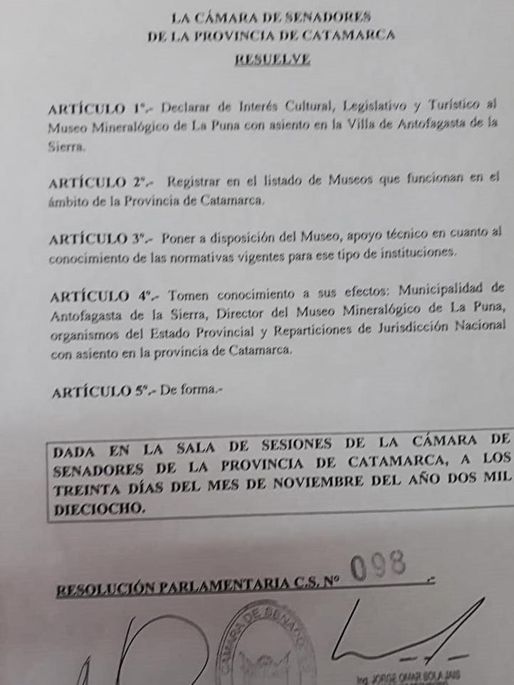 Se trata de la declaración de Interés Cultural, Legislativo y Turístico al Museo Mineralógico de la Puna, ubicado en el departamento Antofagasta de la Sierra.