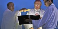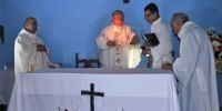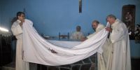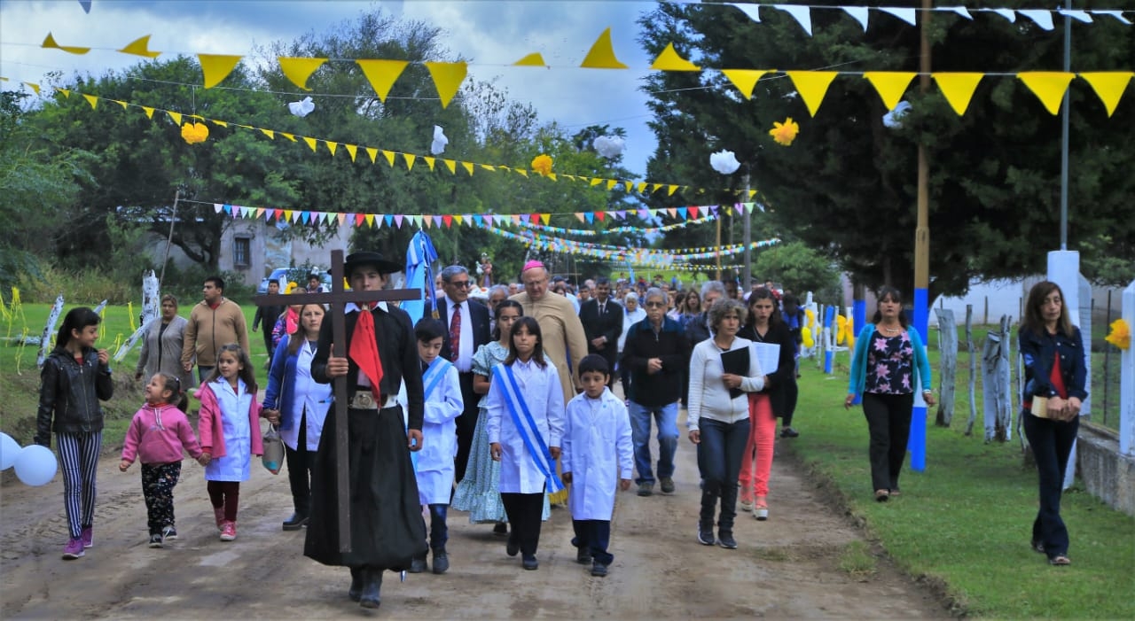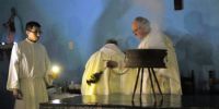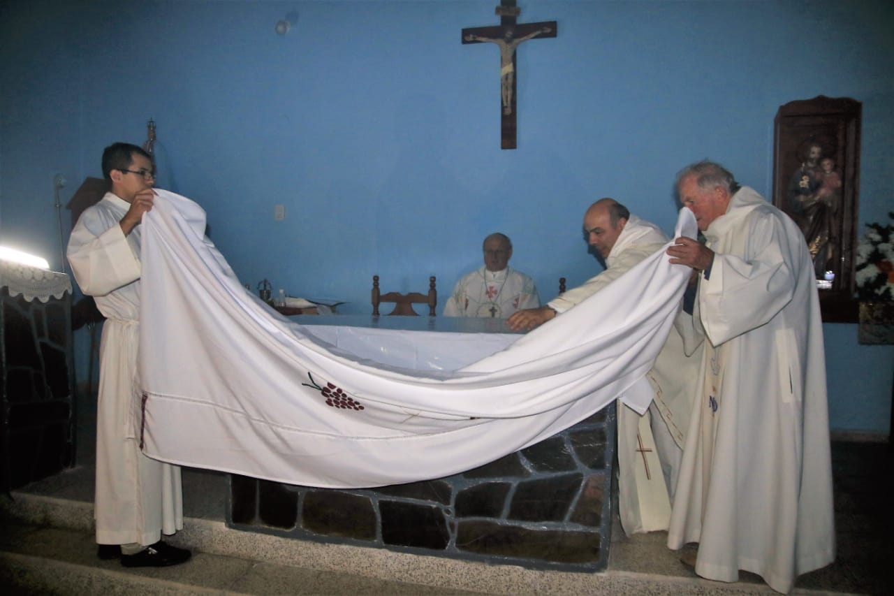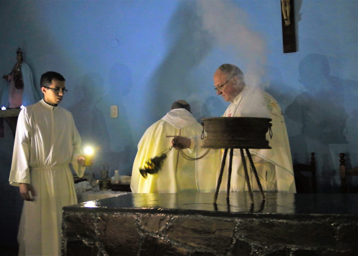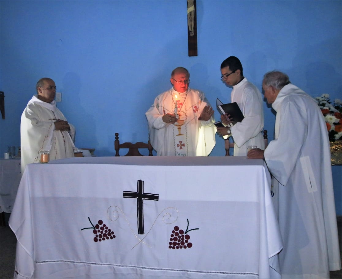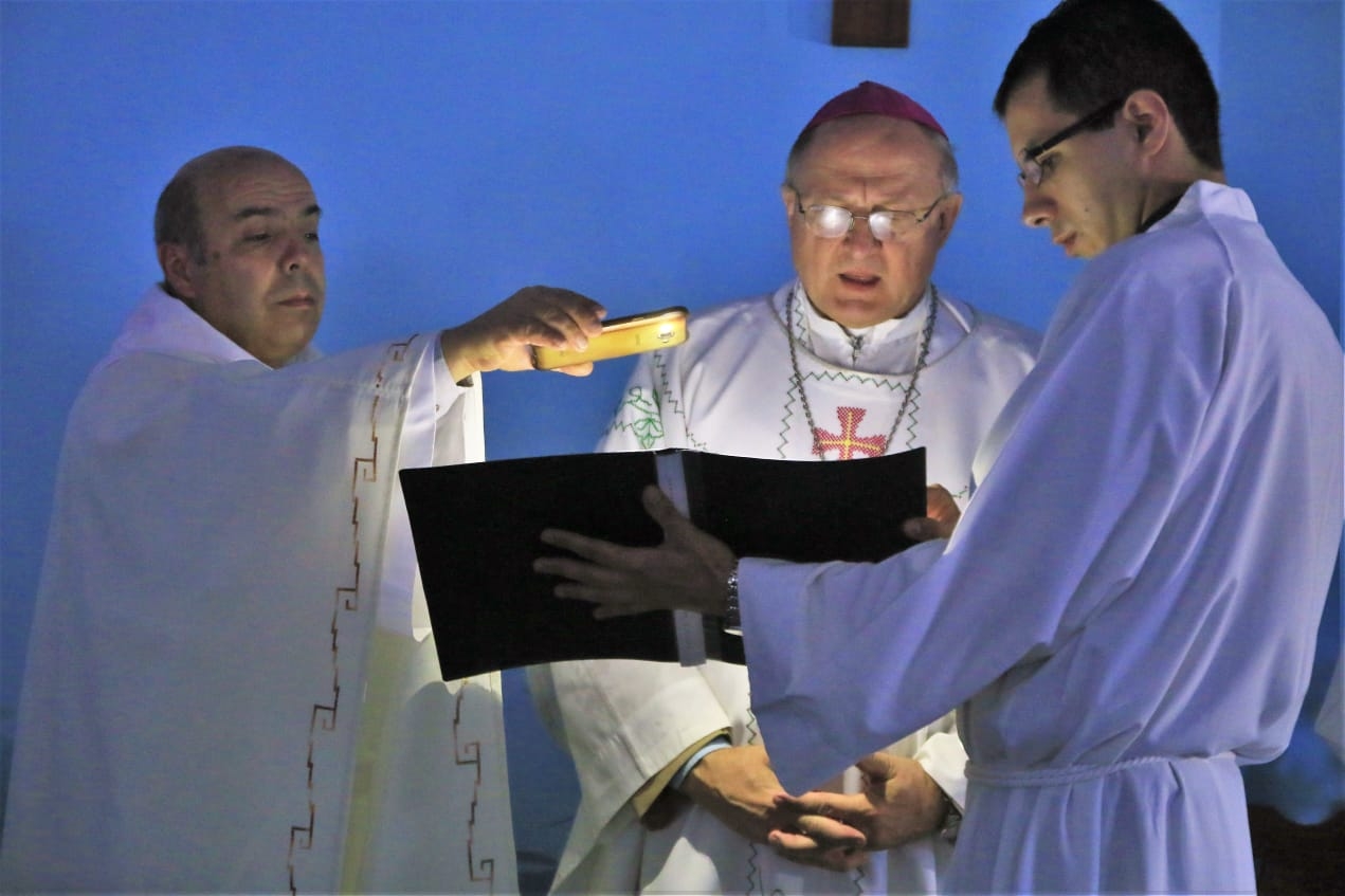 La ceremonia litúrgica, presidida por el Obispo Diocesano, Mons. Luis Urbanc, y concelebrada por el párroco, Pbro. Gerónimo José Paz, se desarrolló a media luz, debido al corte de energía eléctrica que afectó la zona.