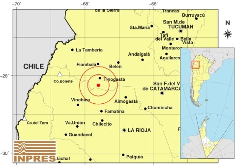 Epicentro: 149 Km. al NO de La Rioja; 184 Km. al O de San F. Del Valle De Catamarca; 21 Km. al S de Tinogasta -28.248 (lat) -67.607 (long)