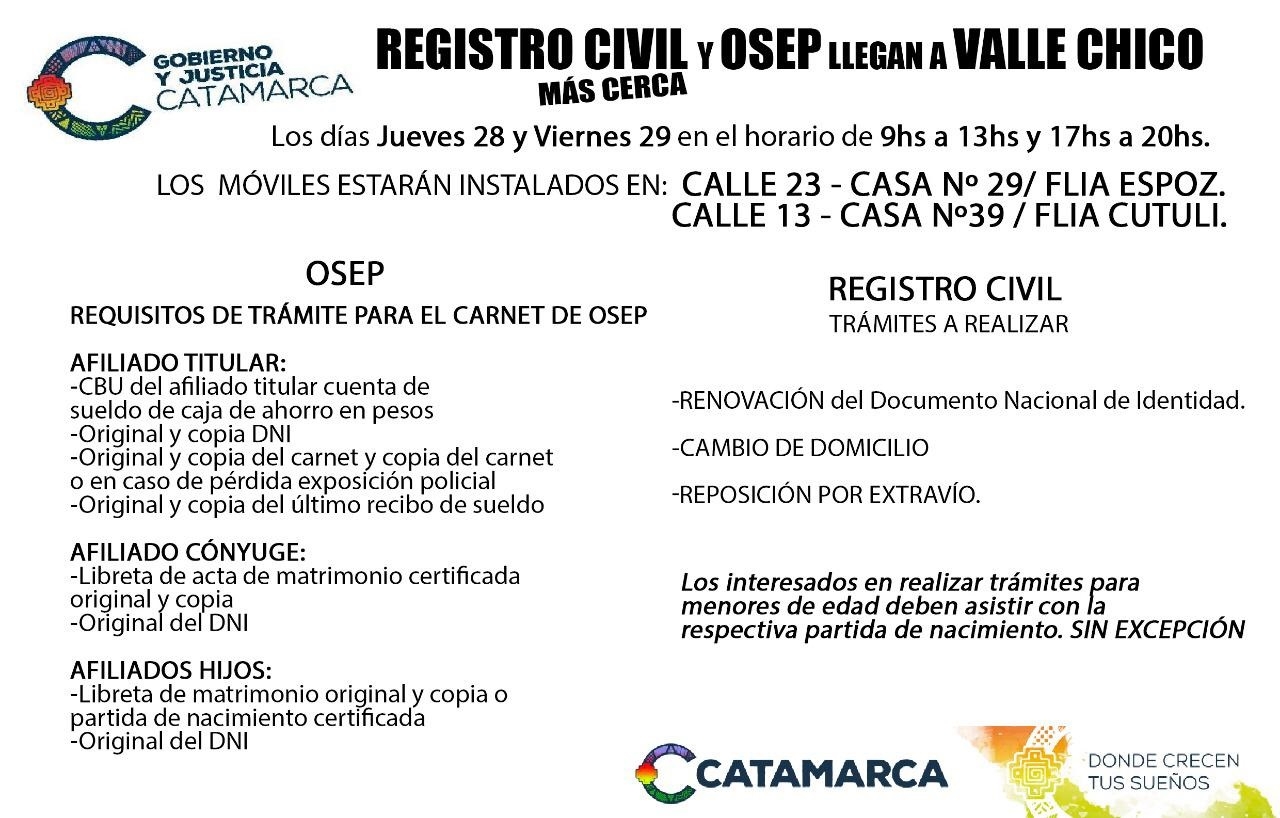 La Obra Social de los Empleados Públicos (OSEP) llegará a Valle Chico, en un trabajo conjunto con el Registro Civil, para continuar con la campaña de renovación de carné para afiliados en este 2019. Los móviles estarán instalados en la Calle 23 – Casa N° 29 / Flia Espoz – y en la Calle 13 – Casa N° 39 / Flia Cutuli – de 9 hs a 13 hs y de 17 hs a 20 hs.
