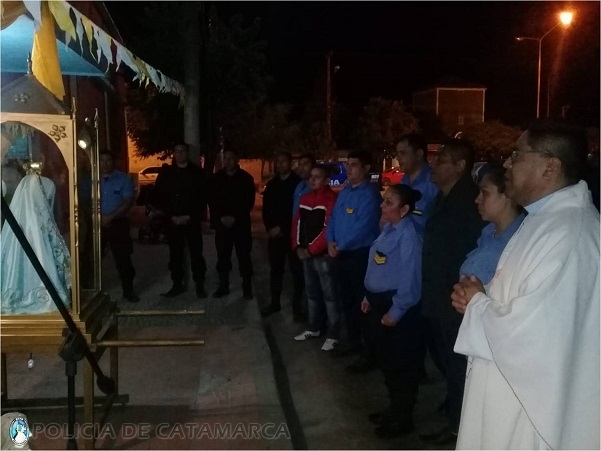 El Jefe de dicha dependencia, junto a los efectivos que prestan servicio en el lugar, recibieron con alegría a la “Morena del Valle”, que fue llevada en andas por el Intendente Pio Carletta y feligreses de la localidad, quienes luego compartieron la Celebración de la Santa Misa, presidida por el Capellán Policial, Of. Principal Pbro. Esteban Chayle.