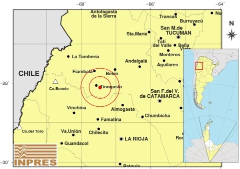 Epicentro: 156 km al NO de La Rioja; 172 km al O de San F. Del Valle De Catamarca; 12 km al SE de Tinogasta -28.112 (lat) -67.455 (long)