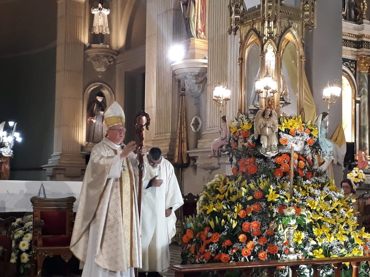 La Sagrada Eucaristía, en la que se dio gracias por un nuevo aniversario de la dedicación del templo, fue presidida por el Obispo Diocesano, Mons. Luis Urbanc, y concelebrada por el Párroco de San Roque (La Chacarita), Pbro. Víctor Hugo Vizcarra, y el Capellán Mayor del Santuario Mariano, Pbro. Lucas Segura.