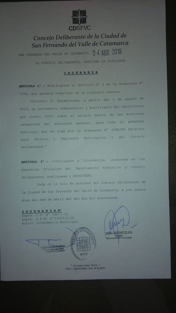 Se modificó el artículo 2 de la ordenanza N°7293 y quedó establecido un aumento salarial del 25 por ciento “remunerativo y bonificable”, a partir del 1 de agosto, tal como solicitaban desde el gremio en relación al acuerdo que habían sellado con el municipio.