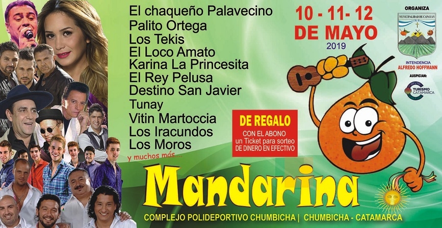 Cabe señalar, que la Cartelera Artística del Festival de la Mandarina 2019 tendrá el valor de las entradas de la siguiente manera, el viernes $ 200, Sábado y Domingo $500 cada día o bien un abono de $ 1000 para los tres días de la Fiesta que podrán ser adquiridas en los locales de Centro Card de las ciudades de La Rioja, Catamarca, Belén, Andalgalá y Recreo y además en el Ateneo Musical de Catamarca.