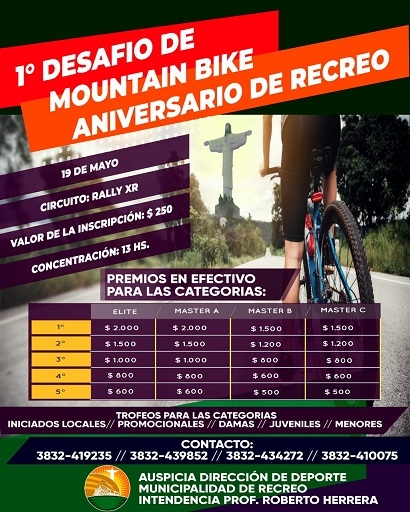 Además, está previsto para el dia 19, el 1er. Desafío Montanbike, aniversario de Recreo, en el circuito de Rally XR, a partir de las 13 hs, con premios en efectivo para todas las categorías. La largada será a los pies del cristo redentor, a la vera de la Ruta 157.