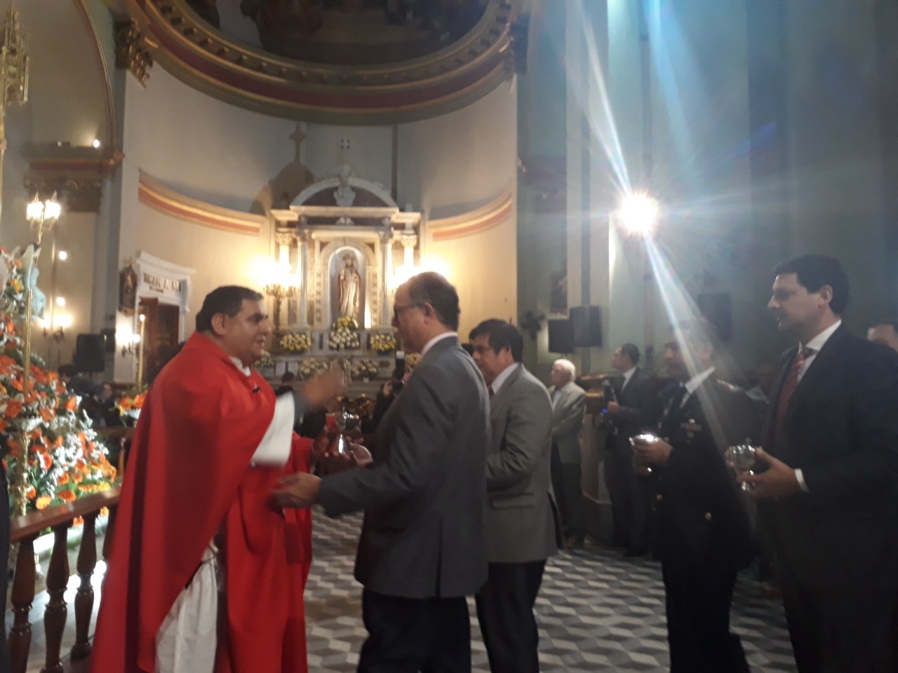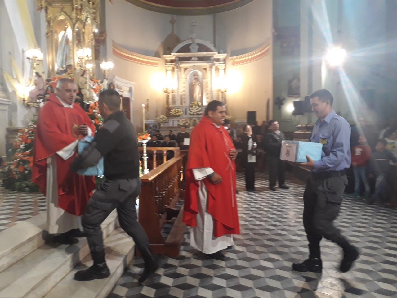En el momento de las ofrendas, las numerosas dependencias de las Fuerzas de Seguridad acercaron al altar ofrendas consistentes en alimentos no perecederos, elementos de higiene, entre otros, para la asistencia de los peregrinos y personas necesitadas, mientras que las autoridades llevaron los dones del pan y el vino.