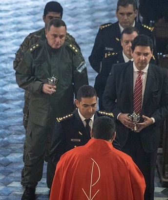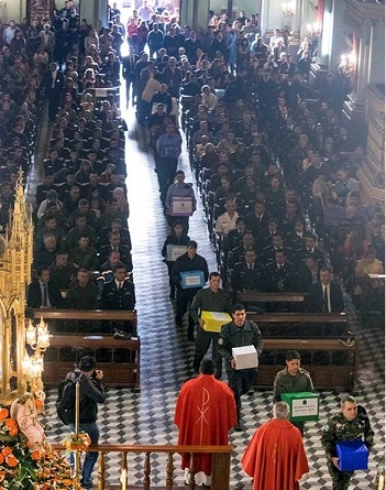 Durante la Eucaristía, efectivos policiales de distintas dependencias acercaron al altar ofrendas de alimentos no perecederos y elementos de limpieza, para compartir con los hermanos más necesitados, y personal designado dio lectura a la Oración del Policía y a la Plegaria del Penitenciario a la Virgen del Valle.