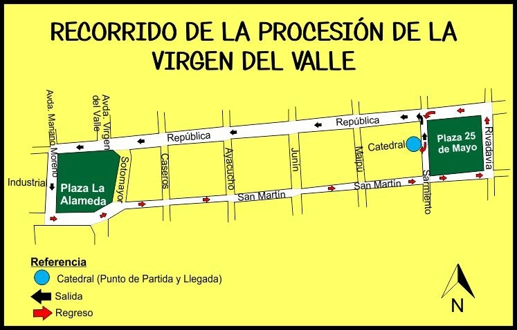Recorrido de la Solemne Procesión: Catedral Basílica, Sarmiento, República, La Alameda, San Martín, plaza 25 de Mayo y Catedral Basílica.