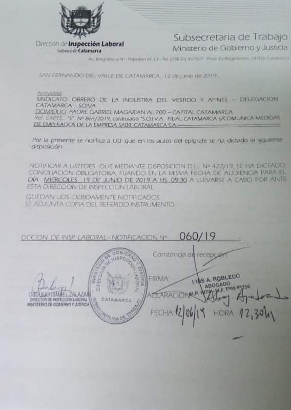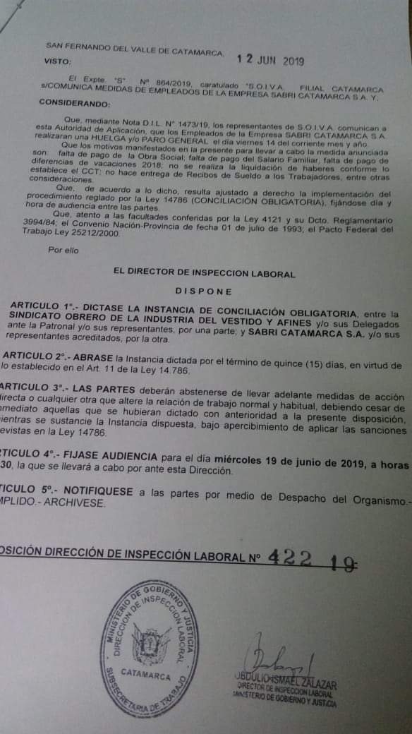 Sin embargo, la Dirección de Inspección Laboral dictó la conciliación obligatoria para el conflicto laboral de los empleados de la textil Sabri, en la ciudad de Recreo, por lo cual las actividades serán normales.