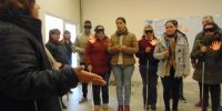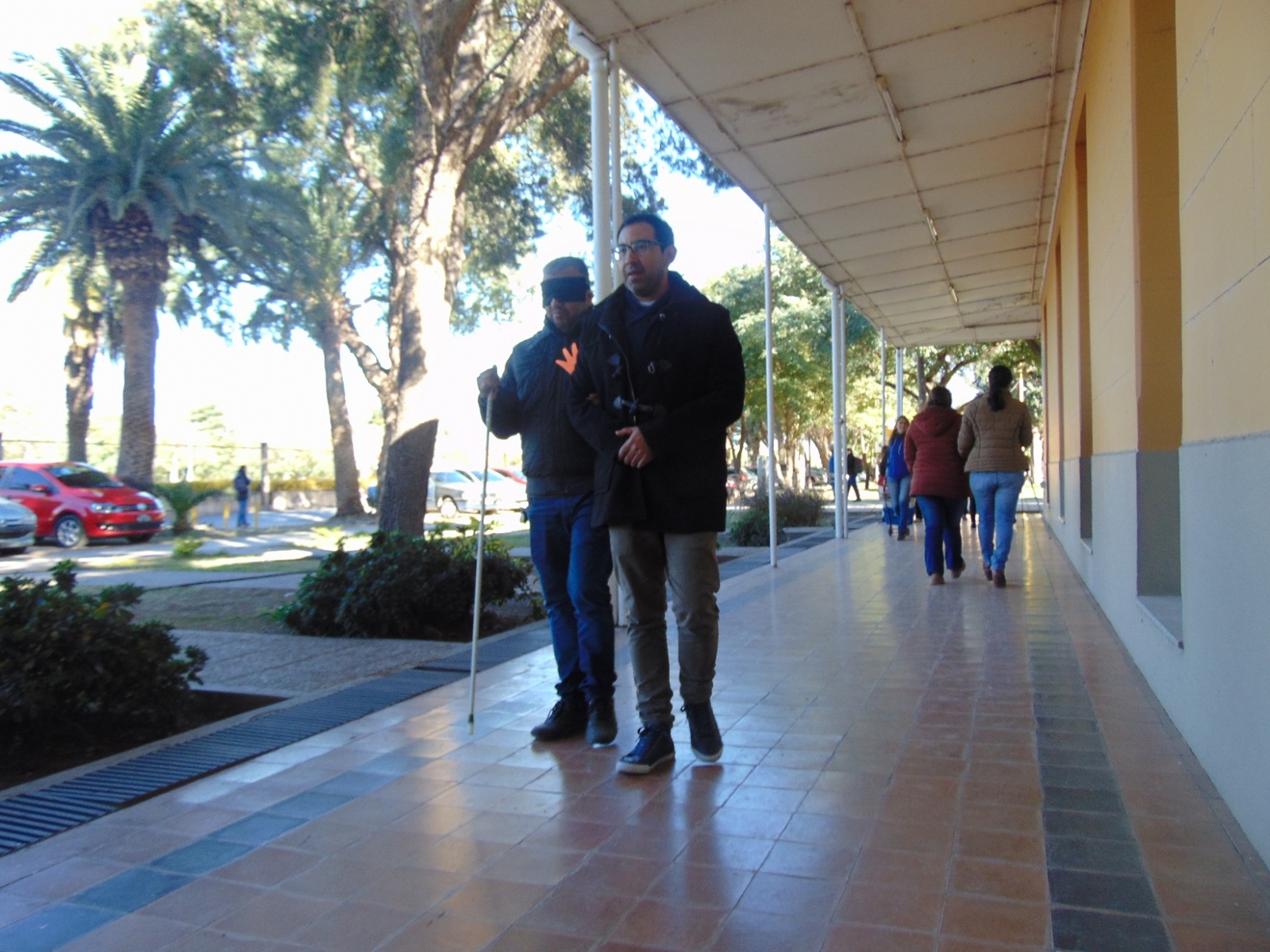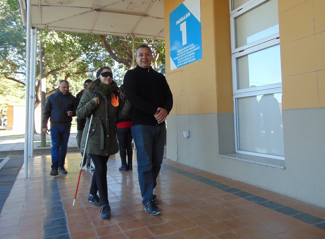 Una experiencia movilizadora para todos los asistentes fue el ponerse en el lugar del otro y, con antiparras que les tapaban los ojos y bastones blancos, vivenciar cómo siente y se moviliza una persona ciega. También cada asistente, a su turno, ofició de guía ayudando a movilizarse y poniendo en práctica todos los recursos ofrecidos para ayudar y facilitar el tránsito y la movilidad a personas ciegas.