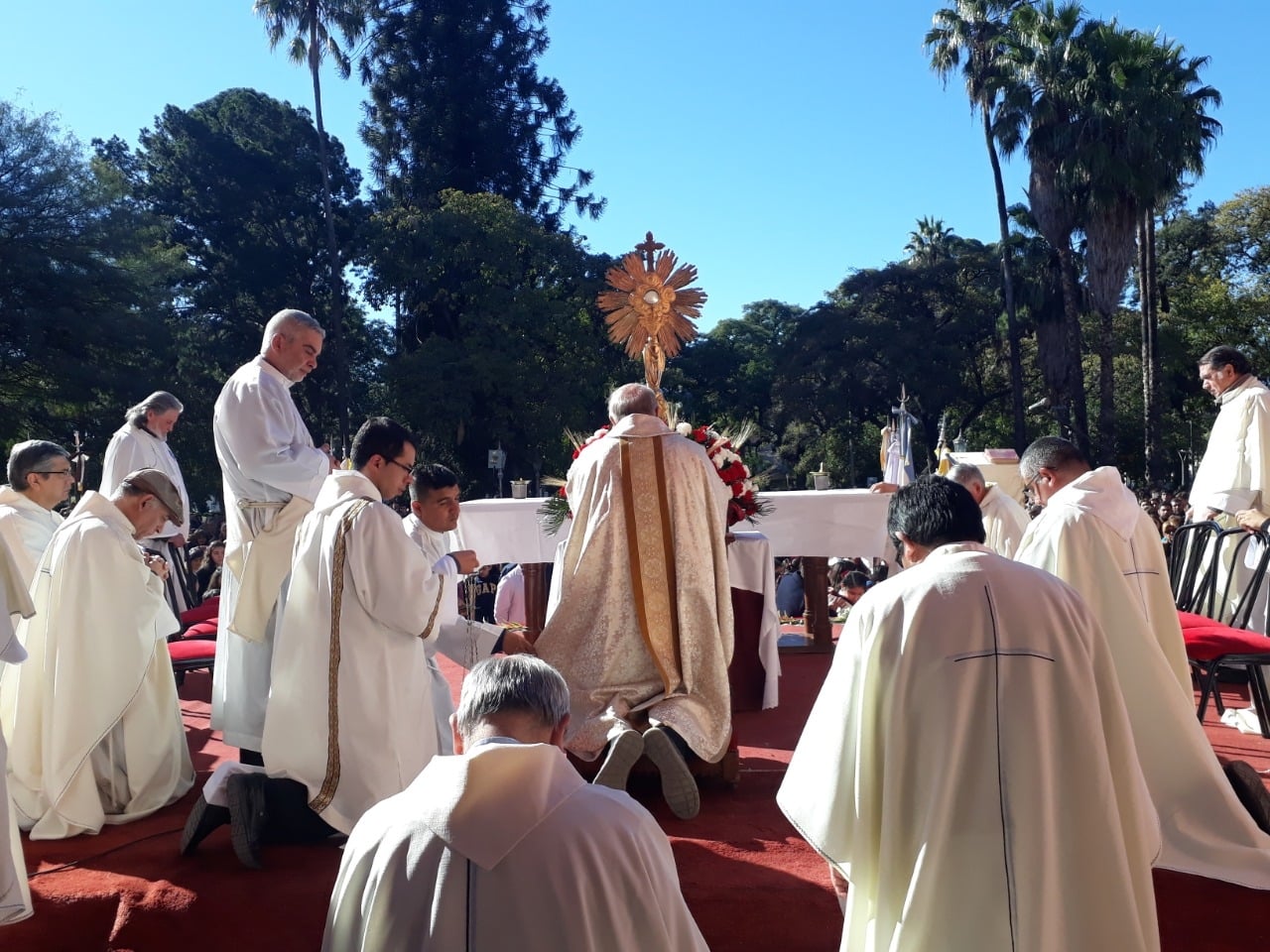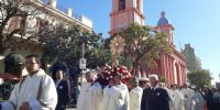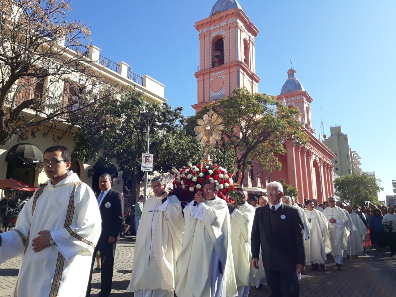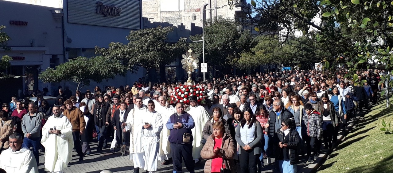 Al finalizar la celebración eucarística, los fieles participaron de la procesión más importante del año, acompañando a Jesús, verdaderamente presente en la Sagrada Eucaristía, alrededor de la plaza 25 de Mayo.