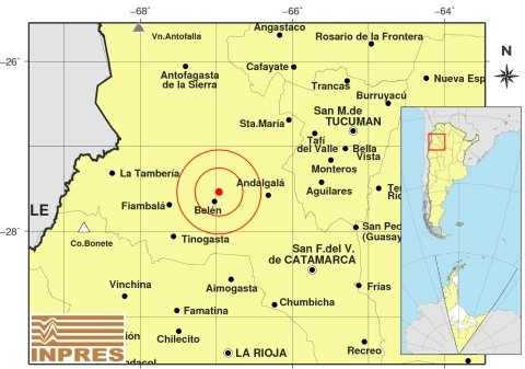 Epicentro: 157 Km. al NO de San F. Del Valle De Catamarca; 192 Km. al SO de San Miguel De Tucumán; 13 Km. al NE de Belén -27.541 (lat) -66.966 (long)