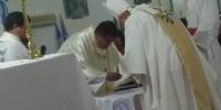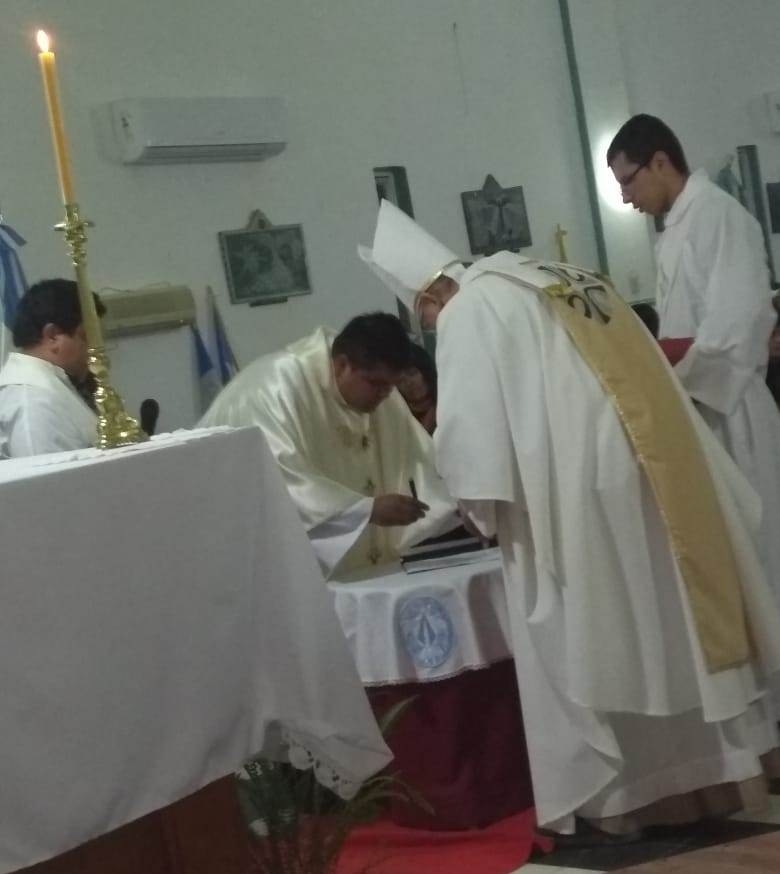En el inicio de la misa se dio lectura al decreto de designación del Administrador Parroquial, quien luego de la homilía de Mons. Urbanc realizó la profesión de fe y el juramento de fidelidad, rubricando luego el acta que registra este importante momento.