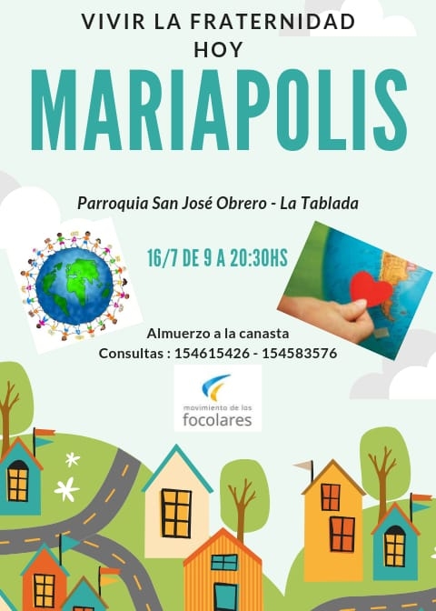 El 16 de julio, de 9.00 a 20.30, en la parroquia de San José Obrero, se desarrollará la Mariápolis, una propuesta del Movimiento de los Focolares, para vivir la fraternidad hoy. El almuerzo será a la canasta.