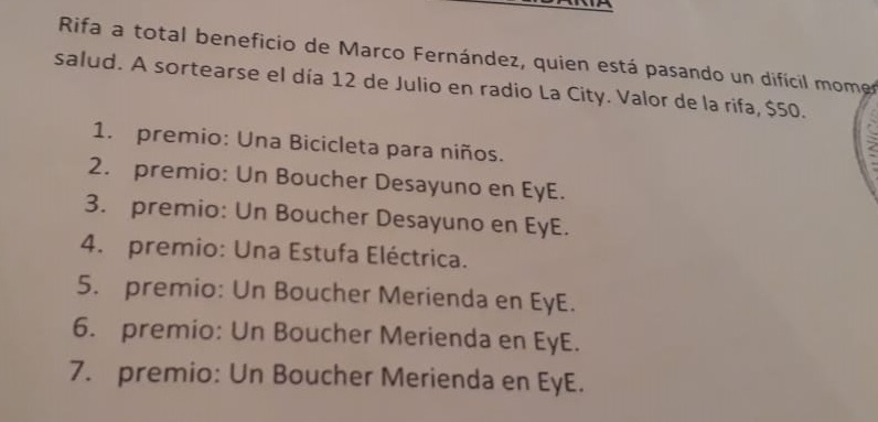 Movilizados por esta situación y enterados de la enfermedad, algunos vecinos del pueblo, de manera desinteresada, se acercaron a la familia y aportaron donaciones para ser ofrecidas como premios y así ayudar a Marco.