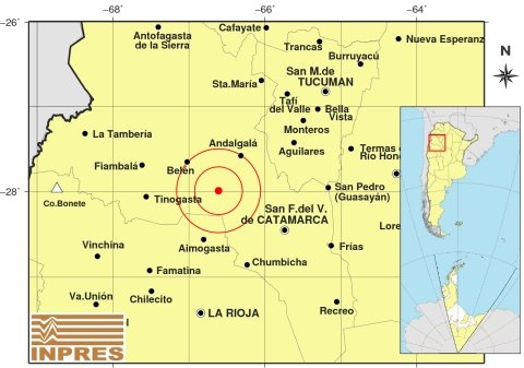 Epicentro: 99 Km. al NO de San F. Del Valle De Catamarca; 159 Km. al N de La Rioja; 54 Km. al SO de Andalgalá -27.991 (lat) -66.611 (long)