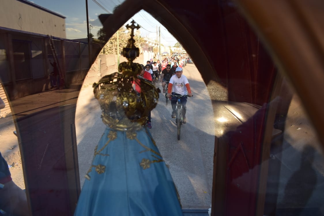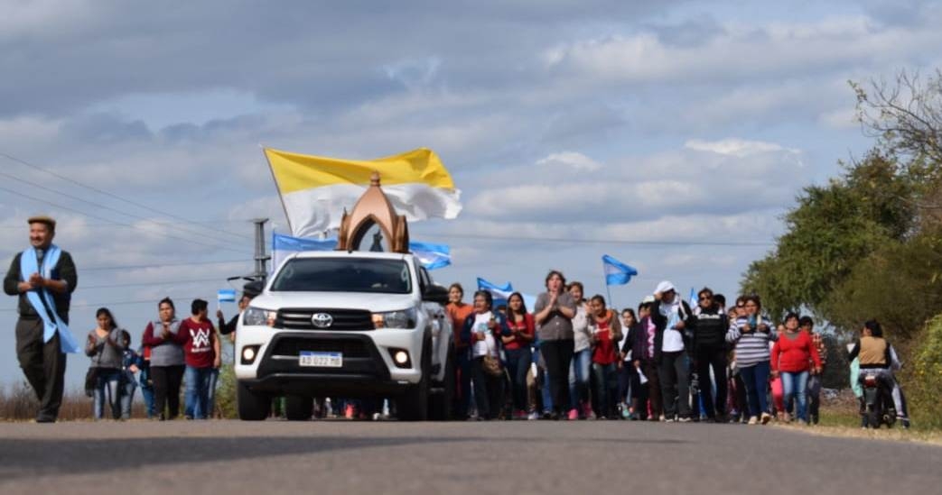 Luego de transitar un par de kilómetros en ruta ingresaron a la ciudad, desde donde fue llevada en procesión hasta el templo puesto bajo su patrocinio, acompañados por el Párroco y el Vicario Parroquial, Pbros. Rubén Gutiérrez y Darío Villordo, respectivamente; con música, bocinazos y cantando. En la capilla se rezó el Santo Rosario y se formaron largas colas para tomar gracia de la Imagen.