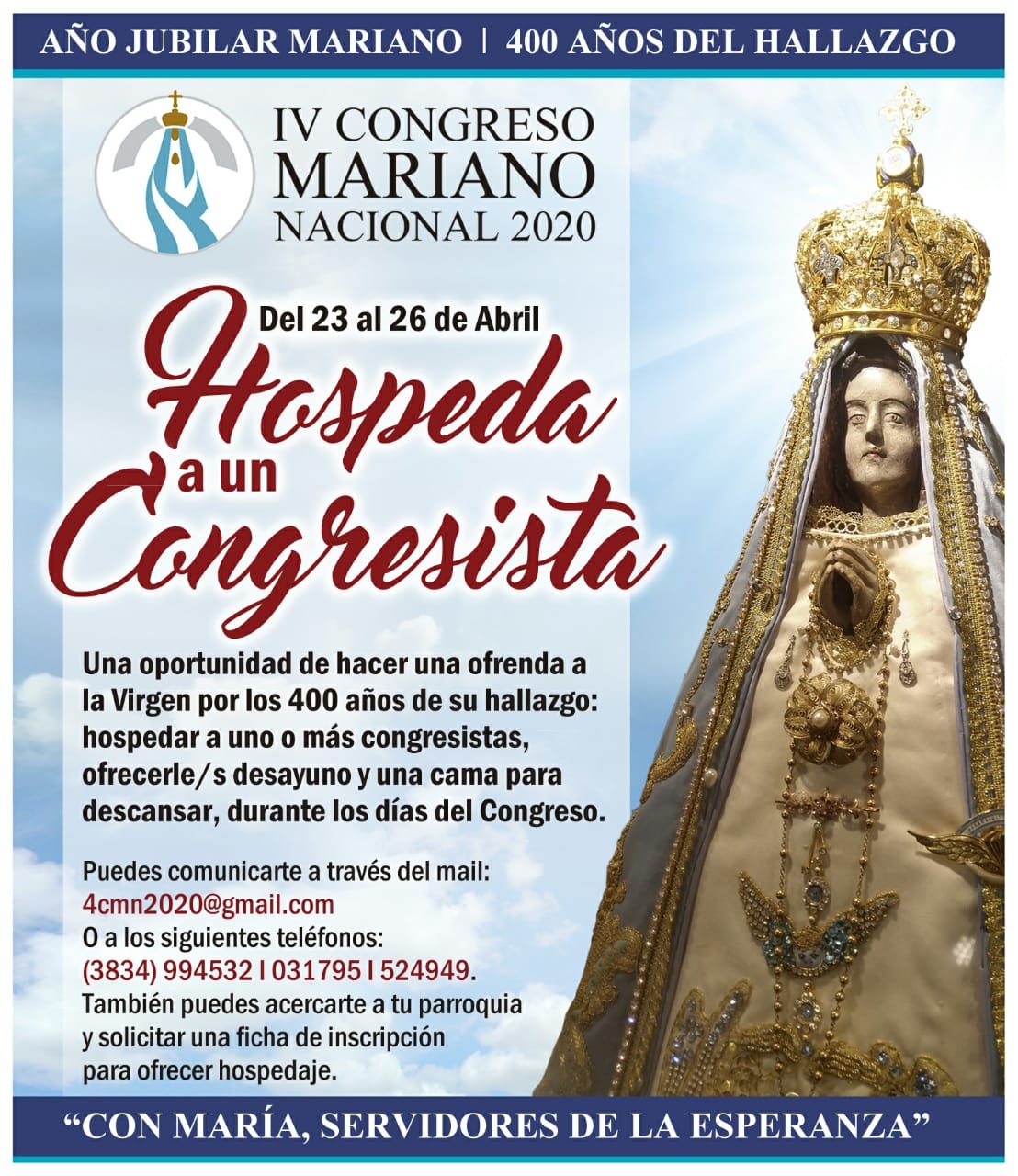 Desde el área de Hospedaje del IV Congreso Mariano Nacional, que tendrá sede en Catamarca del 23 al 26 de abril de 2020, en el marco del Jubileo por los 400 años del hallazgo de la Virgen del Valle y el Año Mariano Nacional, se viene trabajando para recibir a los cerca de 10.000 congresistas de las distintas jurisdicciones eclesiásticas del país, que arribarán a nuestra ciudad para participar de este evento eclesial.