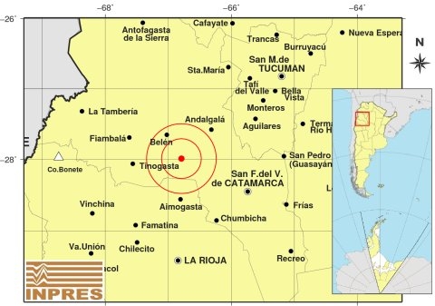 Epicentro: 115 Km. al NO de San F. Del Valle De Catamarca; 158 Km. al N de La Rioja; 44 Km. al SE de Belén -27.988 (lat) -66.792 (long)